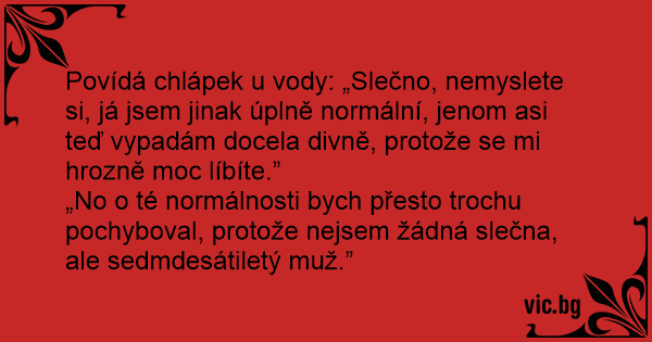 Povídá chlápek u vody: „Slečno, nemyslete si, já jsem jinak úplně normální, jenom asi teď vypadám docela divně, protože se mi hrozně moc líbíte.”