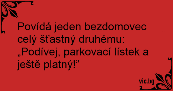 Povídá jeden bezdomovec celý šťastný druhému: „Podívej, parkovací lístek a ještě platný!”