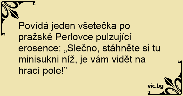 Povídá jeden všetečka po pražské Perlovce pulzující erosence: „Slečno, stáhněte si tu minisukni níž, je vám vidět na hrací pole!”