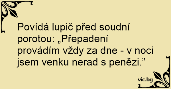 Povídá lupič před soudní porotou: „Přepadení provádím vždy za dne - v noci jsem venku nerad s penězi.”