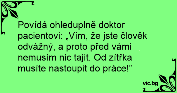 Povídá ohleduplně doktor pacientovi: „Vím, že jste člověk odvážný, a proto před vámi nemusím nic tajit. Od zítřka musíte nastoupit do práce!”