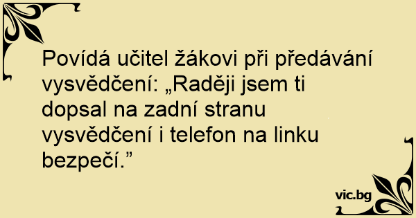 Povídá učitel žákovi při předávání vysvědčení: „Raději jsem ti dopsal na zadní stranu vysvědčení i telefon na linku bezpečí.”