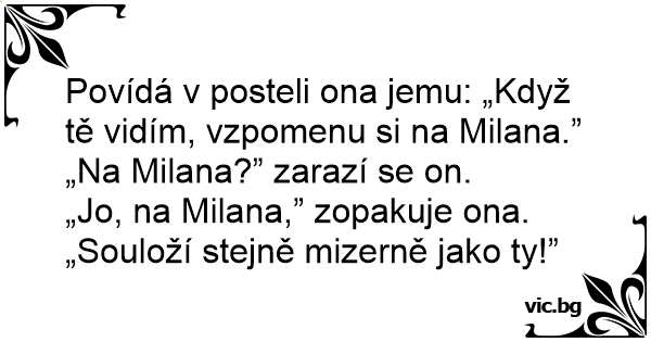 Povídá v posteli ona jemu: „Když tě vidím, vzpomenu si na Milana.”