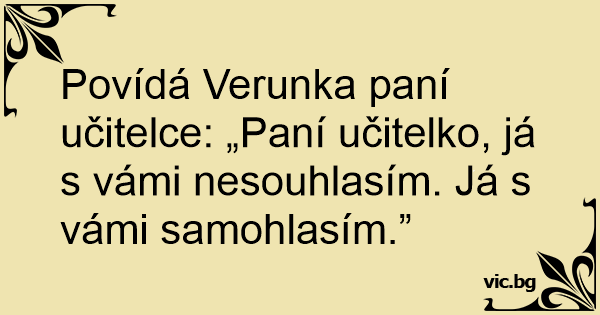 Povídá Verunka paní učitelce: „Paní učitelko, já s vámi nesouhlasím. Já s vámi samohlasím.”