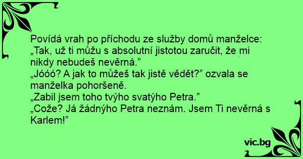 Povídá vrah po příchodu ze služby domů manželce: „Tak, už ti můžu s absolutní jistotou zaručit, že mi nikdy nebudeš nevěrná.”