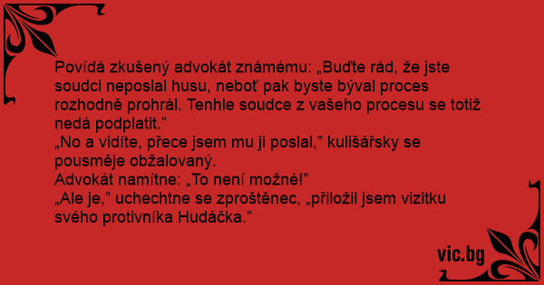 Povídá zkušený advokát známému: „Buďte rád, že jste soudci neposlal husu, neboť pak byste býval proces rozhodně prohrál. Tenhle soudce z vašeho procesu se totiž nedá podplatit.”
