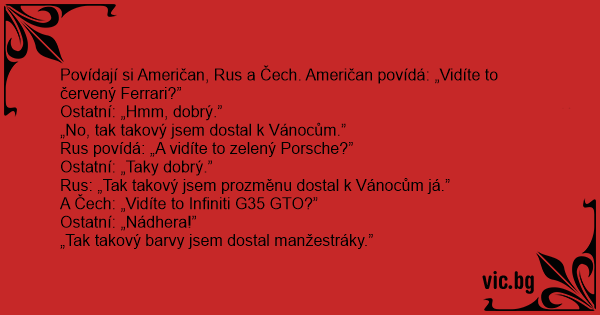 Povídají si Američan, Rus a Čech. Američan povídá: „Vidíte to červený Ferrari?”