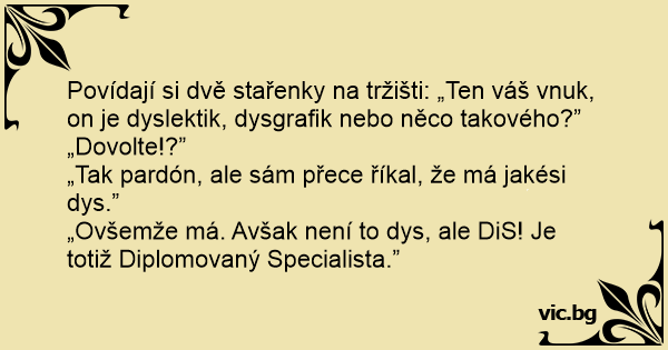 Povídají si dvě stařenky na tržišti: „Ten váš vnuk, on je dyslektik, dysgrafik nebo něco takového?”