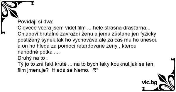 Tý jo to zní fakt krutě ... na to bych taky kouknul,jak se ten film jmenuje? Hledá se Nemo. R*