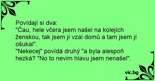 "Nekecej" povídá druhý "a byla alespoň hezká? "No to nevim hlavu jsem nenašel".