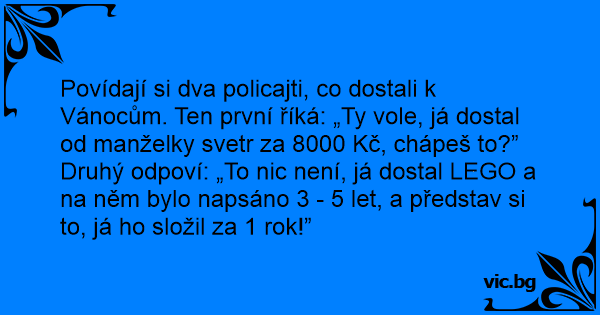 Povídají si dva policajti, co dostali k Vánocům. Ten první říká: „Ty vole, já dostal od manželky svetr za 8000 Kč, chápeš to?”