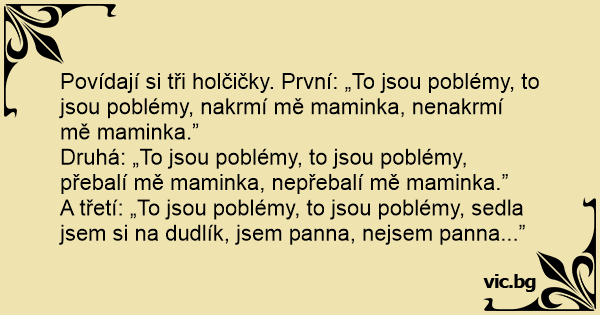 Povídají si tři holčičky. První: „To jsou poblémy, to jsou poblémy, nakrmí mě maminka, nenakrmí mě maminka.”