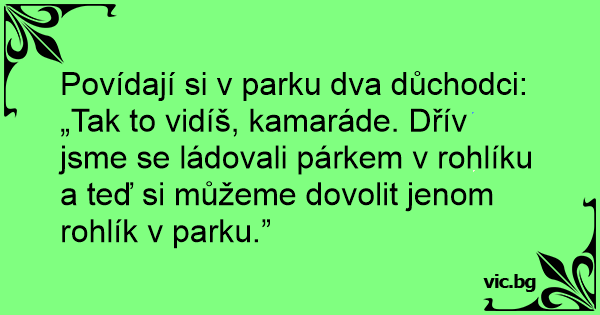 Povídají si v parku dva důchodci: „Tak to vidíš, kamaráde. Dřív jsme se ládovali párkem v rohlíku a teď si můžeme dovolit jenom rohlík v parku.”