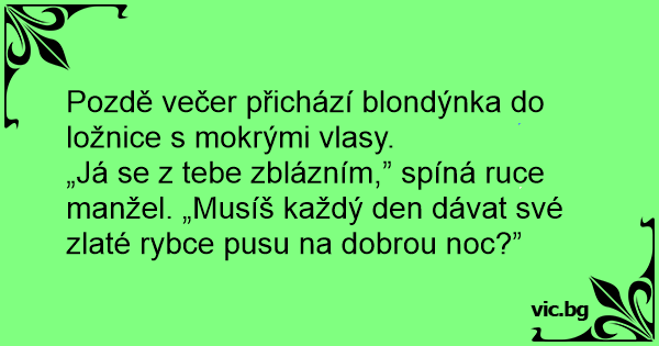 „Já se z tebe zblázním,” spíná ruce manžel. „Musíš každý den dávat své zlaté rybce pusu na dobrou noc?”