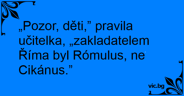„Pozor, děti,” pravila učitelka, „zakladatelem Říma byl Rómulus, ne Cikánus.”