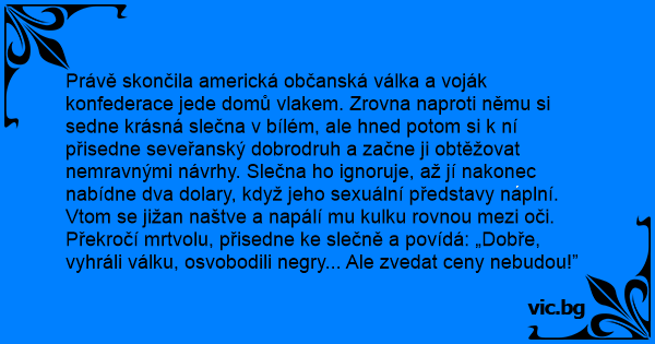 Právě skončila americká občanská válka a voják konfederace jede domů vlakem. Zrovna naproti němu si sedne krásná slečna v bílém, ale hned potom si k ní přisedne seveřanský dobrodruh a začne ji obtěžovat nemravnými návrhy. Slečna hо ignoruje, až jí nakonec nabídne dva dolary, když jeho sexuální představy naplní. Vtom se jižan naštve a napálí mu kulku rovnou mezi oči. Překročí mrtvolu, přisedne ke slečně a povídá: „Dobře, vyhráli válku, osvobodili negry... Ale zvedat ceny nebudou!”