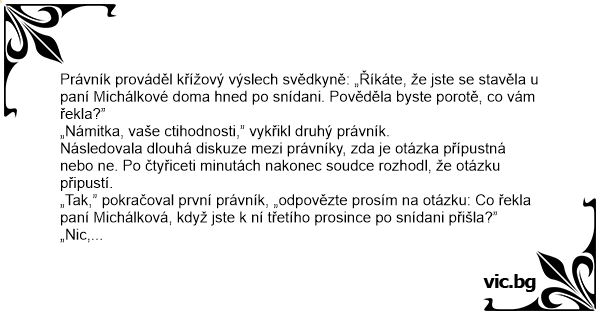 Právník prováděl křížový výslech svědkyně: „Říkáte, že jste se stavěla u paní Michálkové doma hned po snídani. Pověděla byste porotě, co vám řekla?”