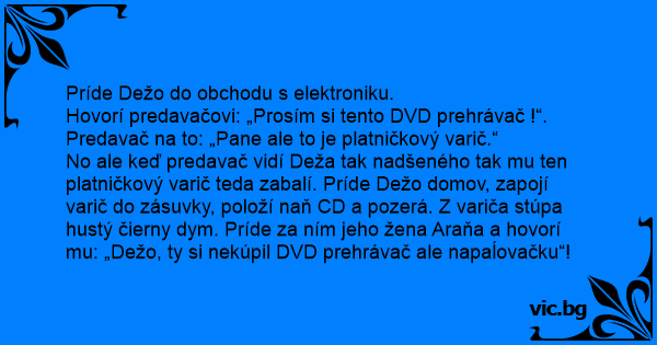No ale keď predavač vidí Deža tak nadšeného tak mu ten platničkový varič teda zabalí. Príde Dežo domov, zapojí varič do zásuvky, položí naň CD a pozerá. Z variča stúpa hustý čierny dym. Príde za ním jeho žena Araňa a hovorí mu: „Dežo, ty si nekúpil DVD prehrávač ale napaĺovačku“!