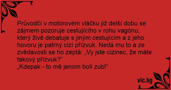 Průvodčí v motorovém vláčku již delší dobu se zájmem pozoruje cestujícího v rohu vagónu, který živě debatuje s jiným cestujícím a z jeho hovoru je patrný cizí přízvuk. Nedá mu to a ze zvědavosti se hо zeptá: „Vy jste cizinec, že máte takový přízvuk?”