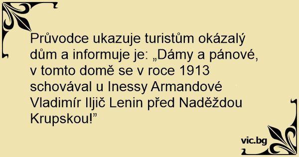 Průvodce ukazuje turistům okázalý dům a informuje je: „Dámy a pánové, v tomto domě se v roce 1913 schovával u Inessy Armandové Vladimír Iljič Lenin před Naděždou Krupskou!”