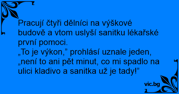„To je výkon,” prohlásí uznale jeden, „není to ani pět minut, co mi spadlo na ulici kladivo a sanitka už je tady!”