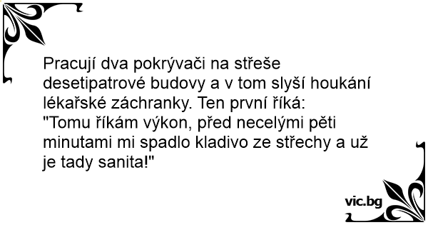 Pracují dva pokrývači na střeše desetipatrové budovy a v tom slyší houkání lékařské záchranky. Ten první říká: