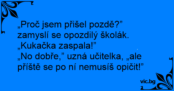 „Proč jsem přišel pozdě?” zamyslí se opozdilý školák. „Kukačka zaspala!”
