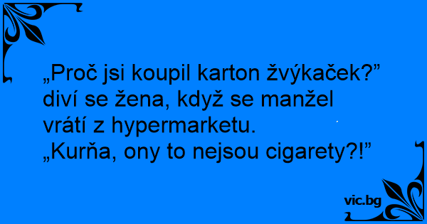 „Proč jsi koupil karton žvýkaček?” diví se žena, když se manžel vrátí z hypermarketu.