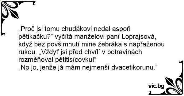 „Proč jsi tomu chudákovi nedal aspoň pětikačku?” vyčítá manželovi paní Loprajsová, když bez povšimnutí mine žebráka s napřaženou rukou. „Vždyť jsi před chvílí v potravinách rozměňoval pětitisícovku!”