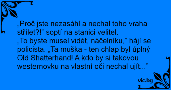 „To byste musel vidět, náčelníku,” hájí se policista. „Ta muška - ten chlap byl úplný Old Shatterhand! A kdo by si takovou westernovku na vlastní oči nechal ujít...”