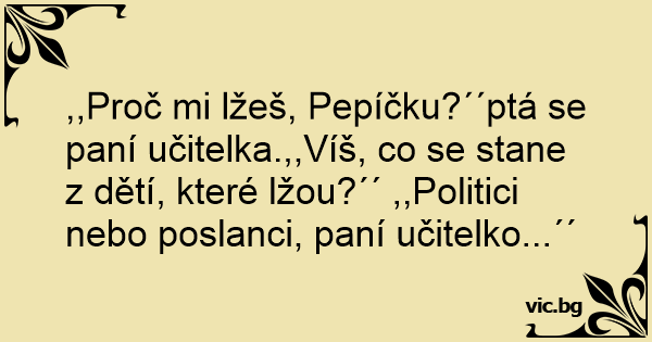 ,,Proč mi lžeš, Pepíčku?´´ptá se paní učitelka.,,Víš, co se stane z dětí, které lžou?´´ ,,Politici nebo poslanci, paní učitelko...´´
