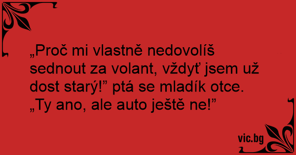 „Proč mi vlastně nedovolíš sednout za volant, vždyť jsem už dost starý!” ptá se mladík otce.