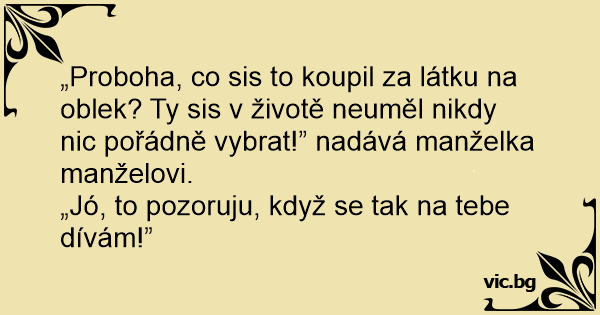 „Proboha, co sis to koupil za látku na oblek? Ty sis v životě neuměl nikdy nic pořádně vybrat!” nadává manželka manželovi.