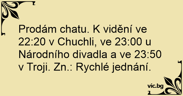Prodám chatu. K vidění ve 22:20 v Chuchli, ve 23:00 u Národního divadla a ve 23:50 v Troji. Zn.: Rychlé jednání.