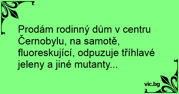 Prodám rodinný dům v centru Černobylu, na samotě, fluoreskující, odpuzuje tříhlavé jeleny a jiné mutanty...