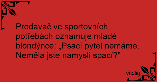 Prodavač ve sportovních potřebách oznamuje mladé blondýnce: „Psací pytel nemáme. Neměla jste namysli spací?”