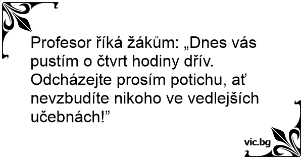 Profesor říká žákům: „Dnes vás pustím o čtvrt hodiny dřív. Odcházejte prosím potichu, ať nevzbudíte nikoho ve vedlejších učebnách!”