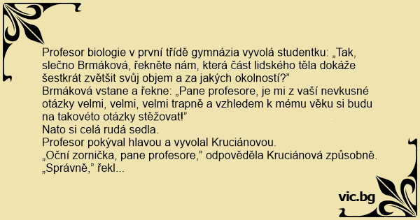 Profesor biologie v první třídě gymnázia vyvolá studentku: „Tak, slečno Brmáková, řekněte nám, která část lidského těla dokáže šestkrát zvětšit svůj objem a za jakých okolností?”