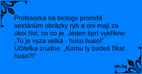 Profesorka na biologii promítá sextánům obrázky ryb a oni mají za úkol říct, co co je. Jeden šprt vykřikne: „To je vyza velká - huso huso!”