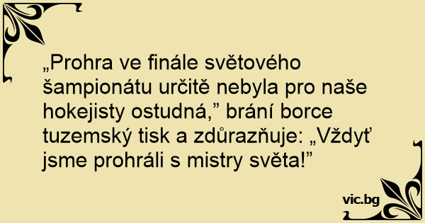 „Prohra ve finále světového šampionátu určitě nebyla pro naše hokejisty ostudná,” brání borce tuzemský tisk a zdůrazňuje: „Vždyť jsme prohráli s mistry světa!”