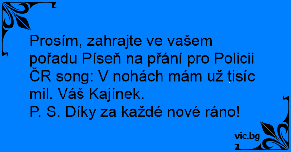 Prosím, zahrajte ve vašem pořadu Píseň na přání pro Policii ČR song: V nohách mám už tisíc mil. Váš Kajínek.