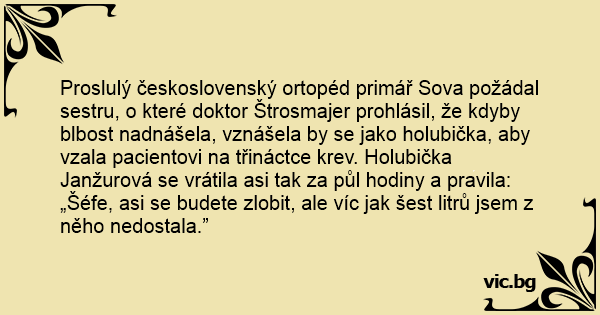 Proslulý československý ortopéd primář Sova požádal sestru, o které doktor Štrosmajer prohlásil, že kdyby blbost nadnášela, vznášela by se jako holubička, aby vzala pacientovi na třináctce krev. Holubička Janžurová se vrátila asi tak za půl hodiny a pravila: „Šéfe, asi se budete zlobit, ale víc jak šest litrů jsem z něho nedostala.”