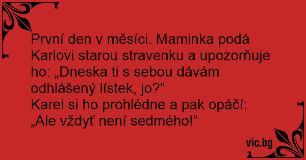 První den v měsíci. Maminka podá Karlovi starou stravenku a upozorňuje hо: „Dneska ti s sebou dávám odhlášený lístek, jo?”
