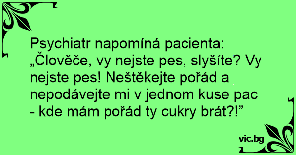 Psychiatr napomíná pacienta: „Člověče, vy nejste pes, slyšíte? Vy nejste pes! Neštěkejte pořád a nepodávejte mi v jednom kuse pac - kde mám pořád ty cukry brát?!”