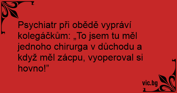 Psychiatr při obědě vypráví kolegáčkům: „To jsem tu měl jednoho chirurga v důchodu a když měl zácpu, vyoperoval si hovno!”