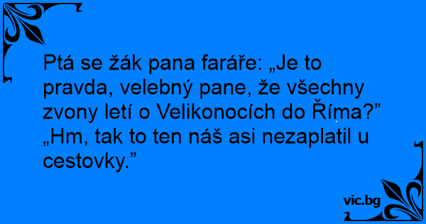Ptá se žák pana faráře: „Je to pravda, velebný pane, že všechny zvony letí o Velikonocích do Říma?”