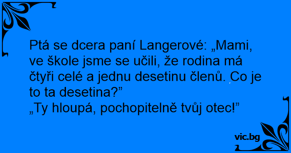 Ptá se dcera paní Langerové: „Mami, ve škole jsme se učili, že rodina má čtyři celé a jednu desetinu členů. Co je to ta desetina?”