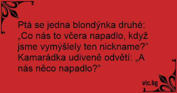 Ptá se jedna blondýnka druhé: „Co nás to včera napadlo, když jsme vymýšlely ten nickname?” Kamarádka udiveně odvětí: „A nás něco napadlo?”