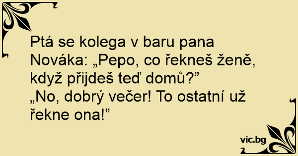Ptá se kolega v baru pana Nováka: „Pepo, co řekneš ženě, když přijdeš teď domů?”