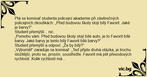 Ptá se komisař studenta policejní akademie při závěrečných policejních zkouškách: „Před budovou školy stojí bílý Favorit. Jaké je barvy?”